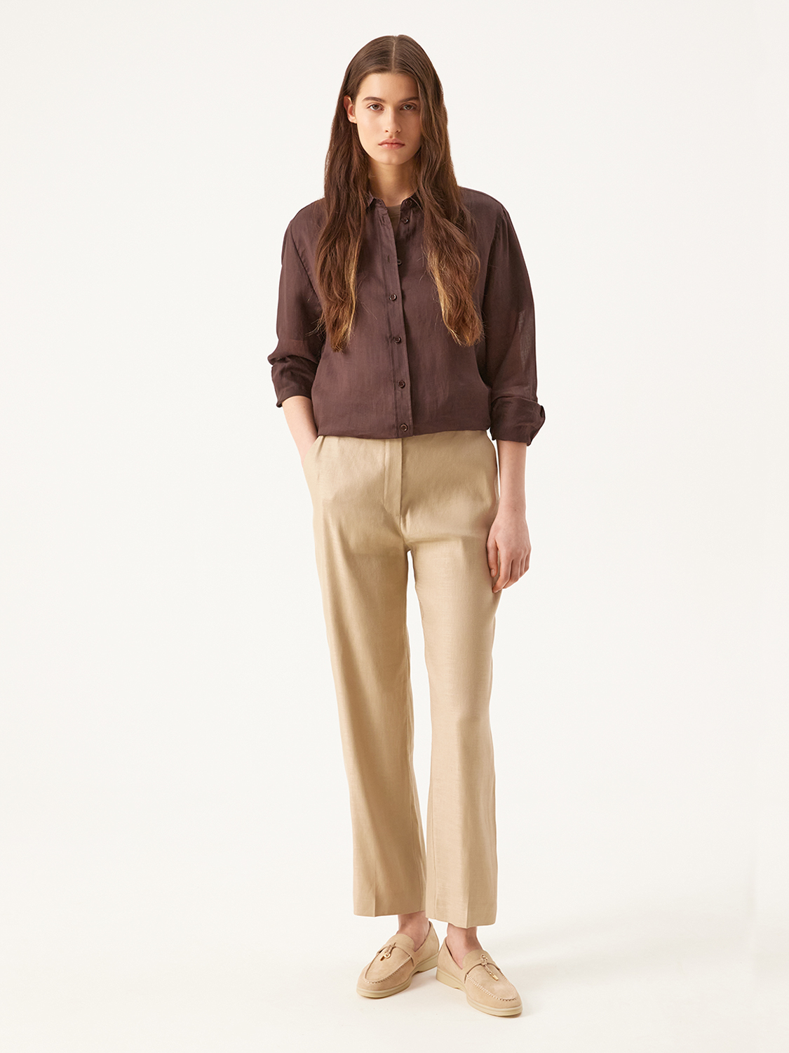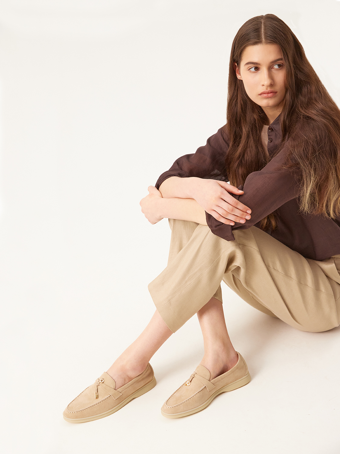 Лаконичные и элегантные лоферы созданы для комфорта в течение всего дня. Выполнены из натуральной мягкой замши, которая добавит непринужденной роскоши и благородства даже простому образу. С удобной стелькой из натуральной кожи. Контрастная молочная подошва добавляет гибкости и легкости походке, а металлический декор игривости. Станут дополнением для костюмов, романтичных платьев и образов с джинсами.