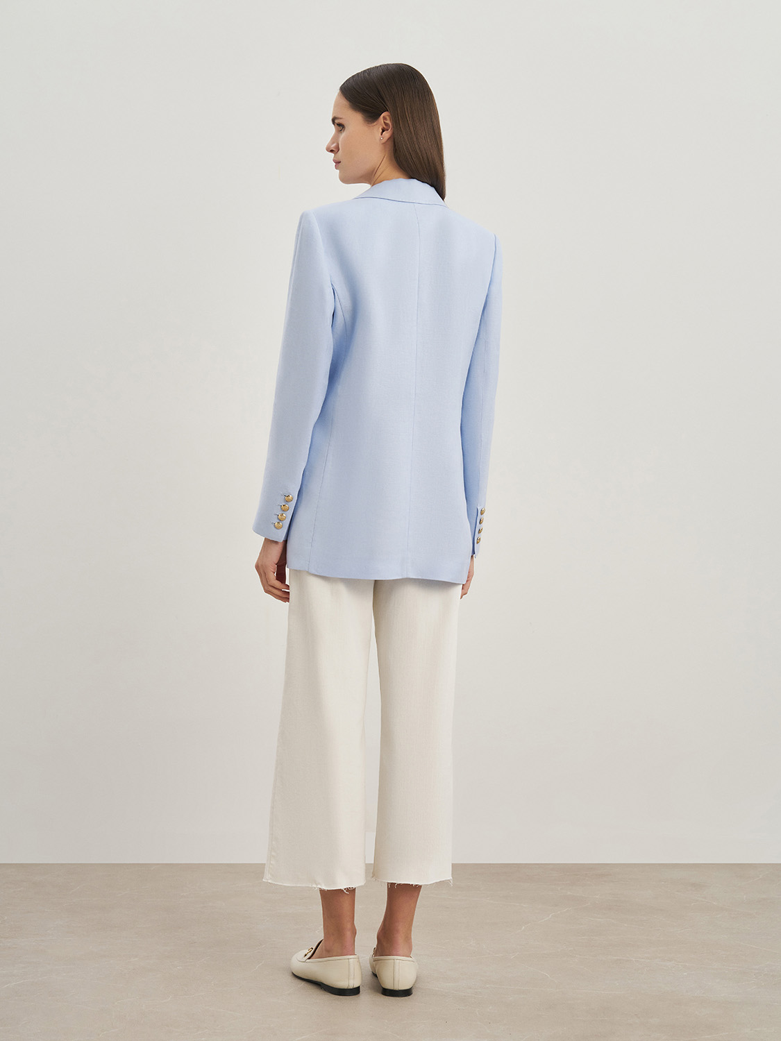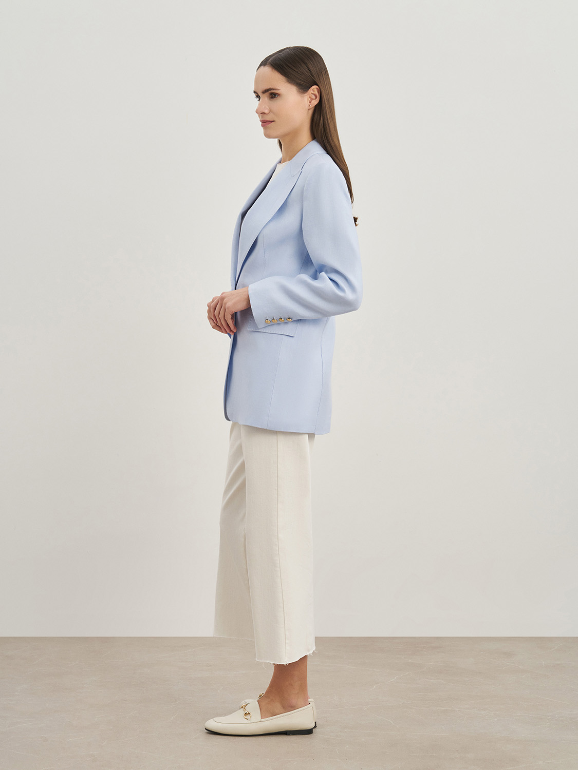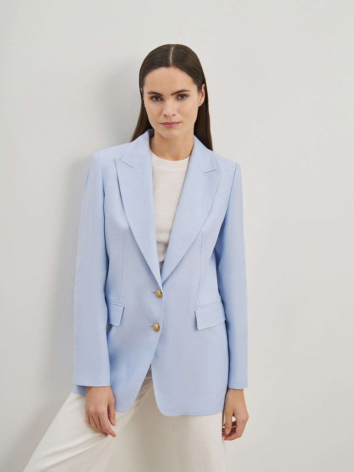 Элегантный полуприталенный жакет из натурального льна. Классический ворот с лацканами, декоративные клапаны, застежка на две пуговицы и пуговицы на рукавах. Благодаря натуральному составу ткани и подкладке, жакет сохраняет форму, не деформируется, в нем будет комфортно в жаркую погоду. Сочетайте с джинсами, брюками изо льна, топами и блузами. На модели размер S. Параметры модели: рост 174, 84-63-88.