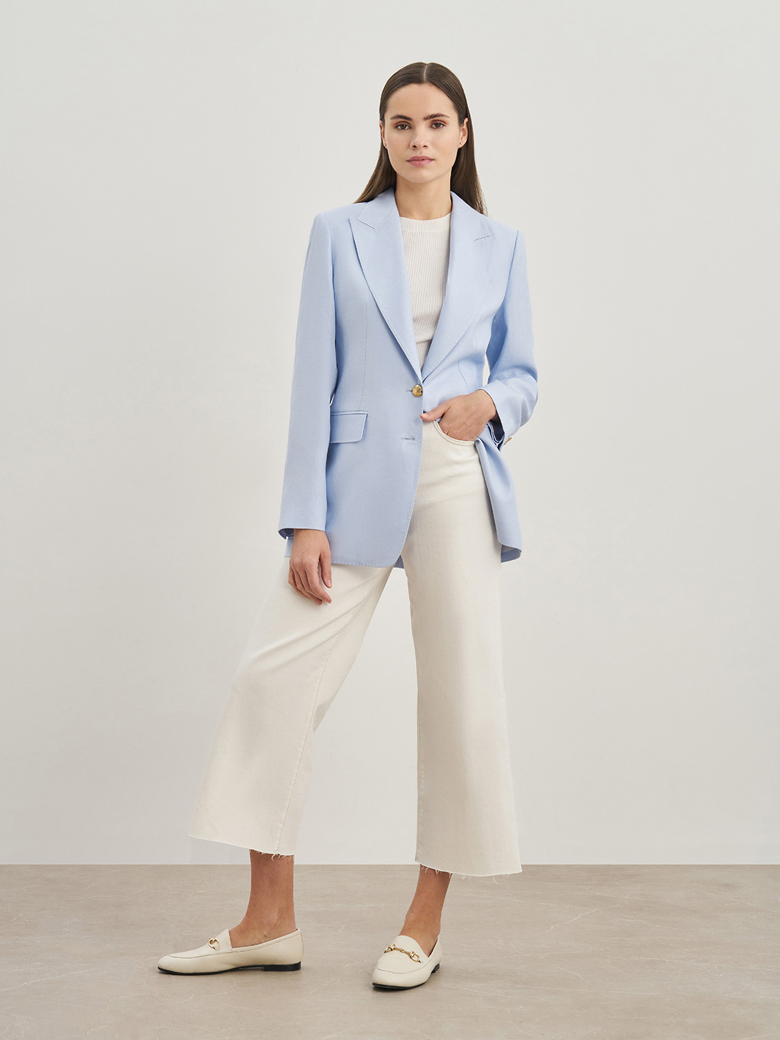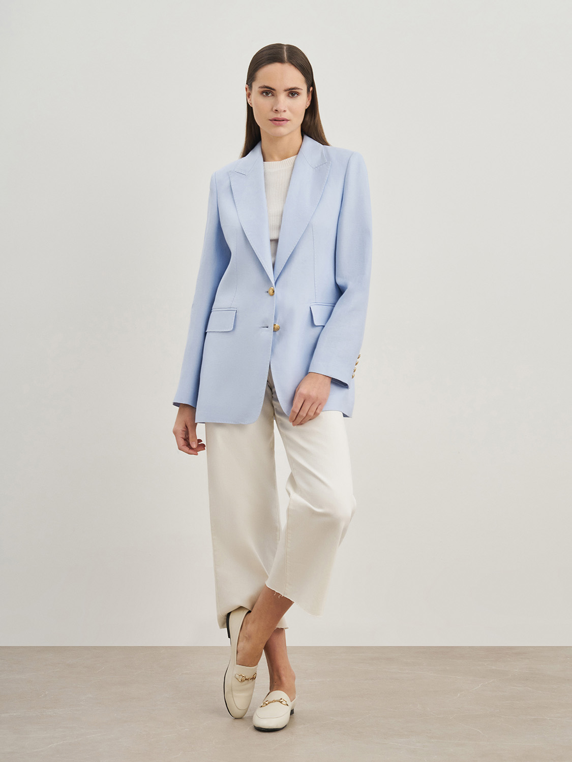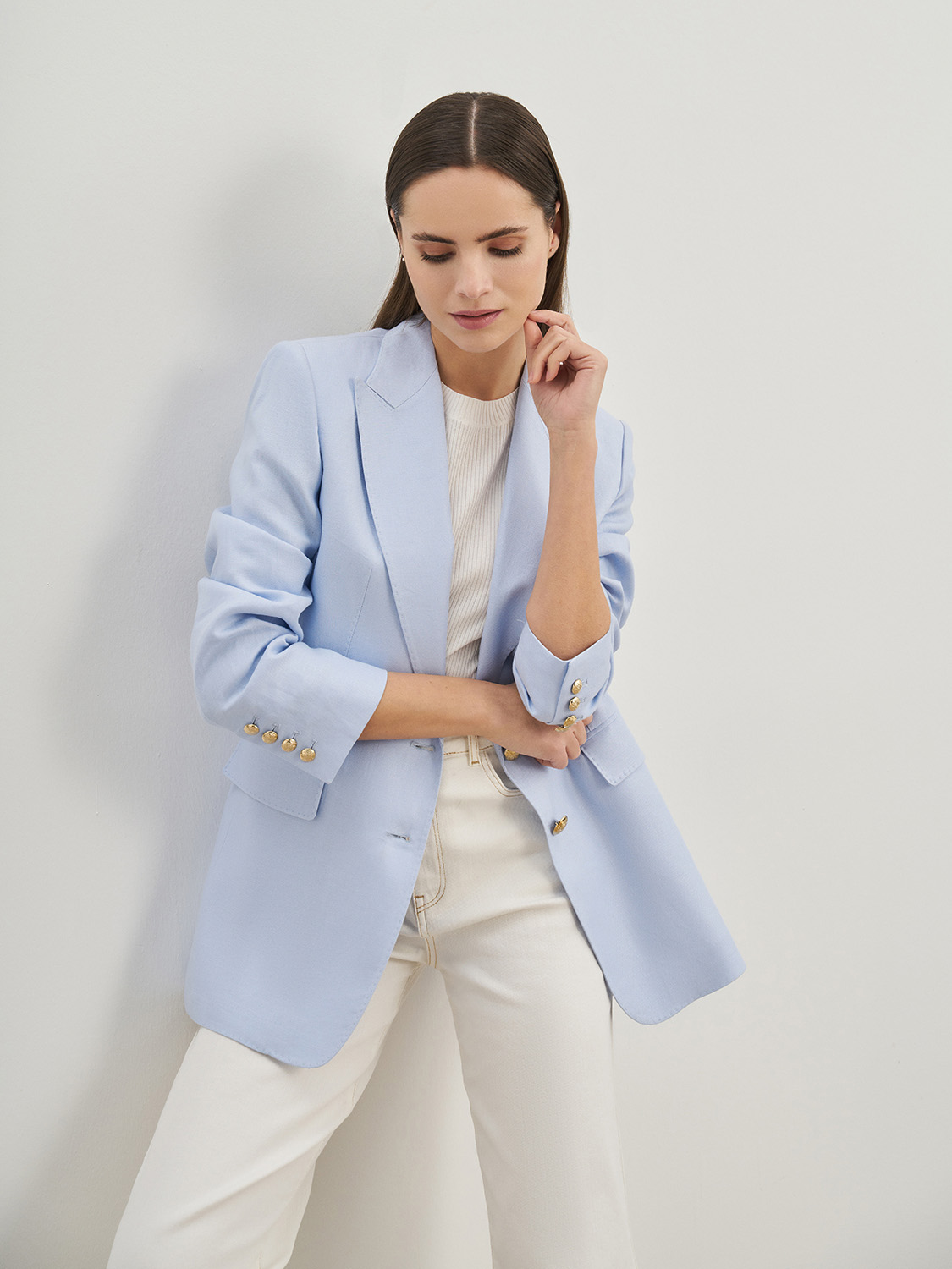 Элегантный полуприталенный жакет из натурального льна. Классический ворот с лацканами, декоративные клапаны, застежка на две пуговицы и пуговицы на рукавах. Благодаря натуральному составу ткани и подкладке, жакет сохраняет форму, не деформируется, в нем будет комфортно в жаркую погоду. Сочетайте с джинсами, брюками изо льна, топами и блузами. На модели размер S. Параметры модели: рост 174, 84-63-88.