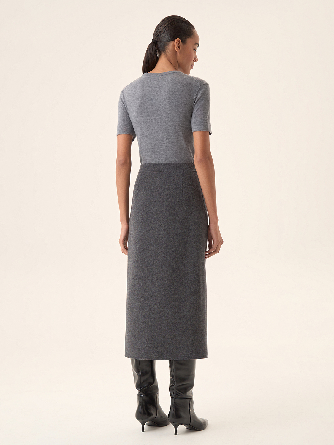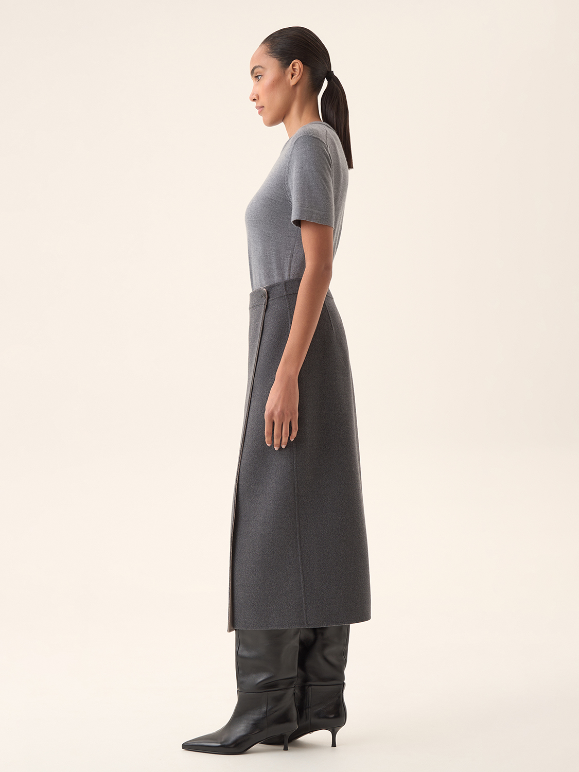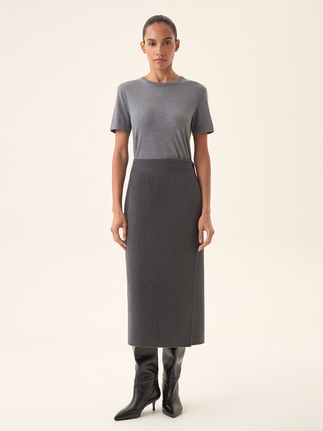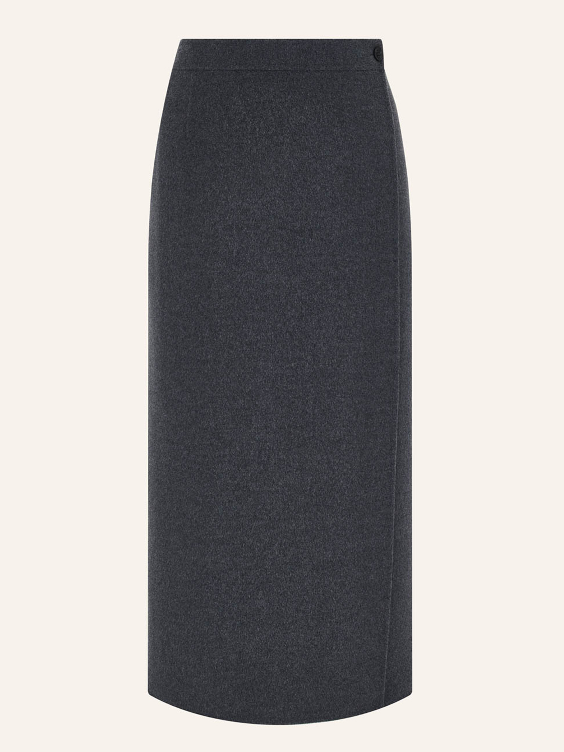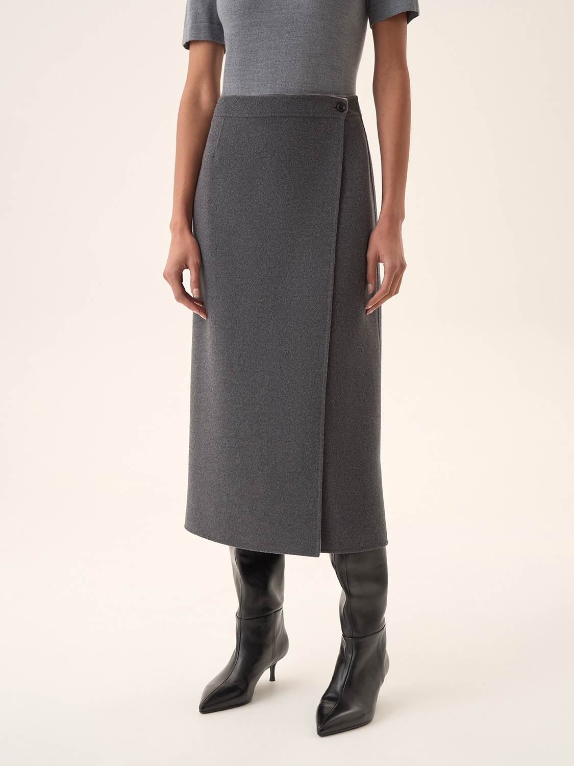 Юбка миди из шерсти — это идеальный выбор для создания элегантного и утонченного образа. Модель выполнена в строгом и лаконичном крое, который подчеркивает силуэт, оставаясь при этом достаточно свободной для комфорта и свободы движений. Шерстяной материал обеспечивает тепло и уют, делая юбку подходящей для холодного сезона. Асимметричный запах добавляет изделию современности и оригинальности, привлекая внимание к деталям. Эта юбка легко сочетается как с классическими рубашками и блузами, так и с более повседневными элементами гардероба, что делает ее универсальным дополнением к любому наряду.