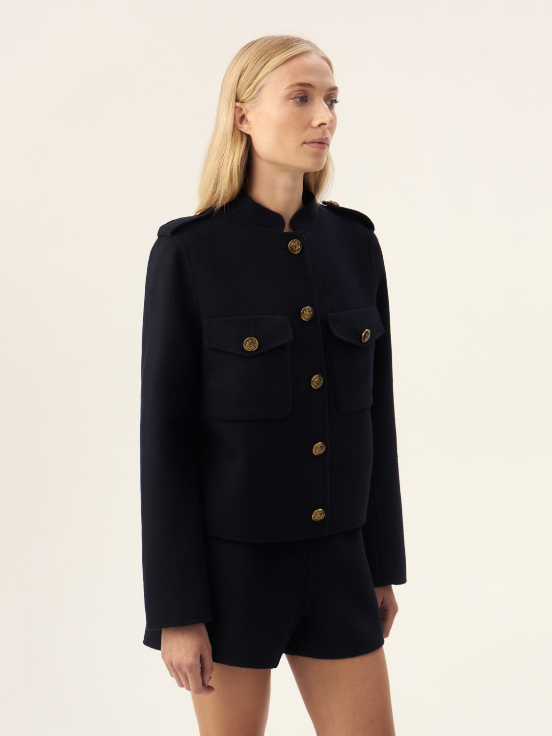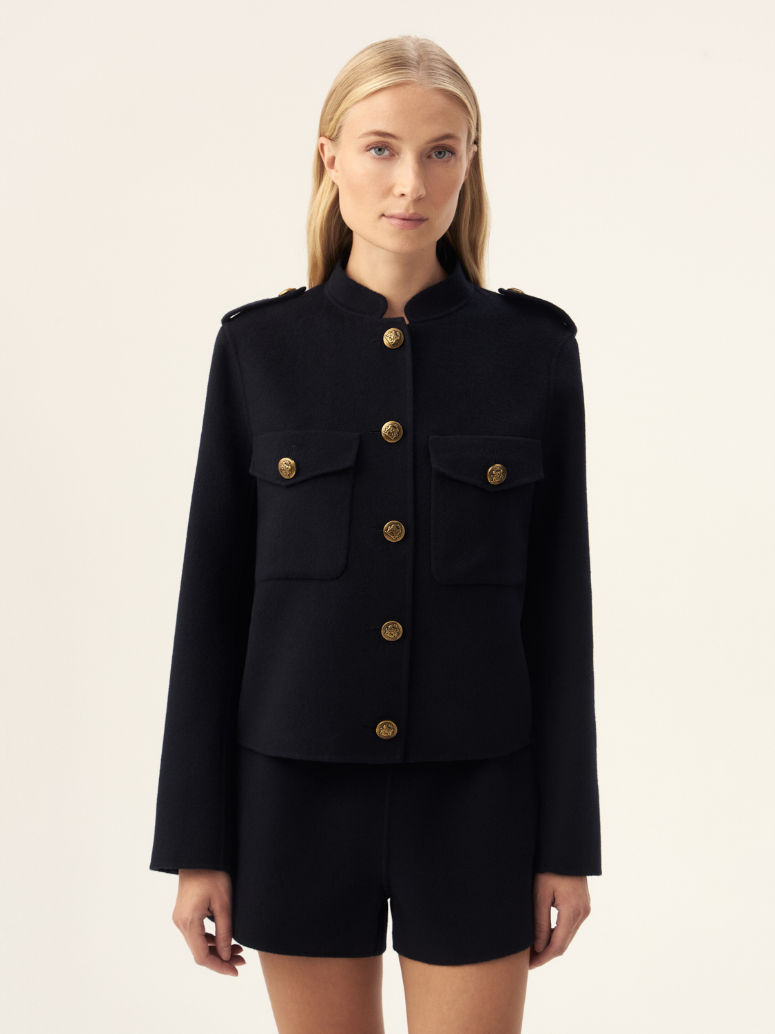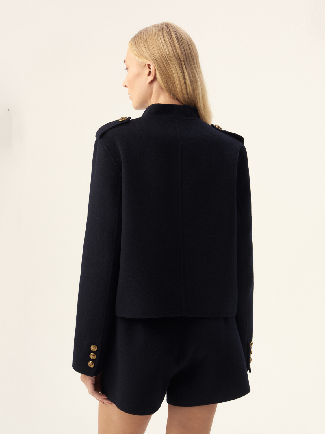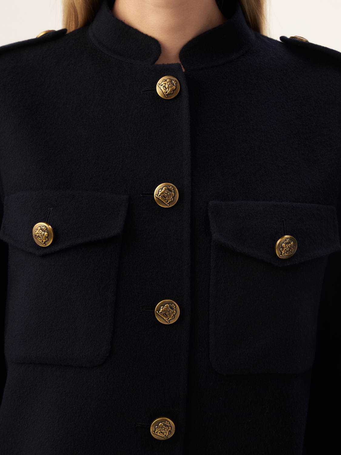Этот жакет из шерсти мериноса — стильное сочетание комфорта и элегантности. Его короткий крой и классическая форма создают эффектный силуэт, а мягкий материал обеспечивает тепло и приятные ощущения при носке. Золотые пуговицы и карманы с клапанами добавляют жакету утонченности и оригинальности, делая его идеальным выбором как для офисных образов, так и для вечерних выходов. Сочетайте его с брюками или юбками, чтобы создать элегантный и завершенный лук в любое время года.